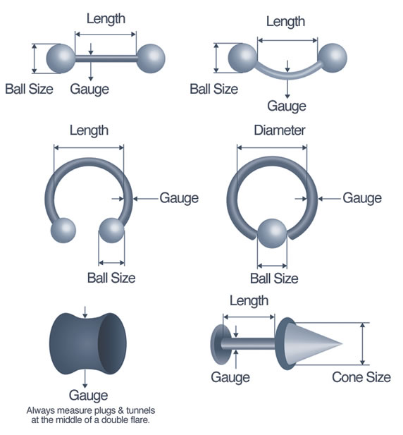 Choose a chart from below to look and match your current body jewellery to get the correct size.